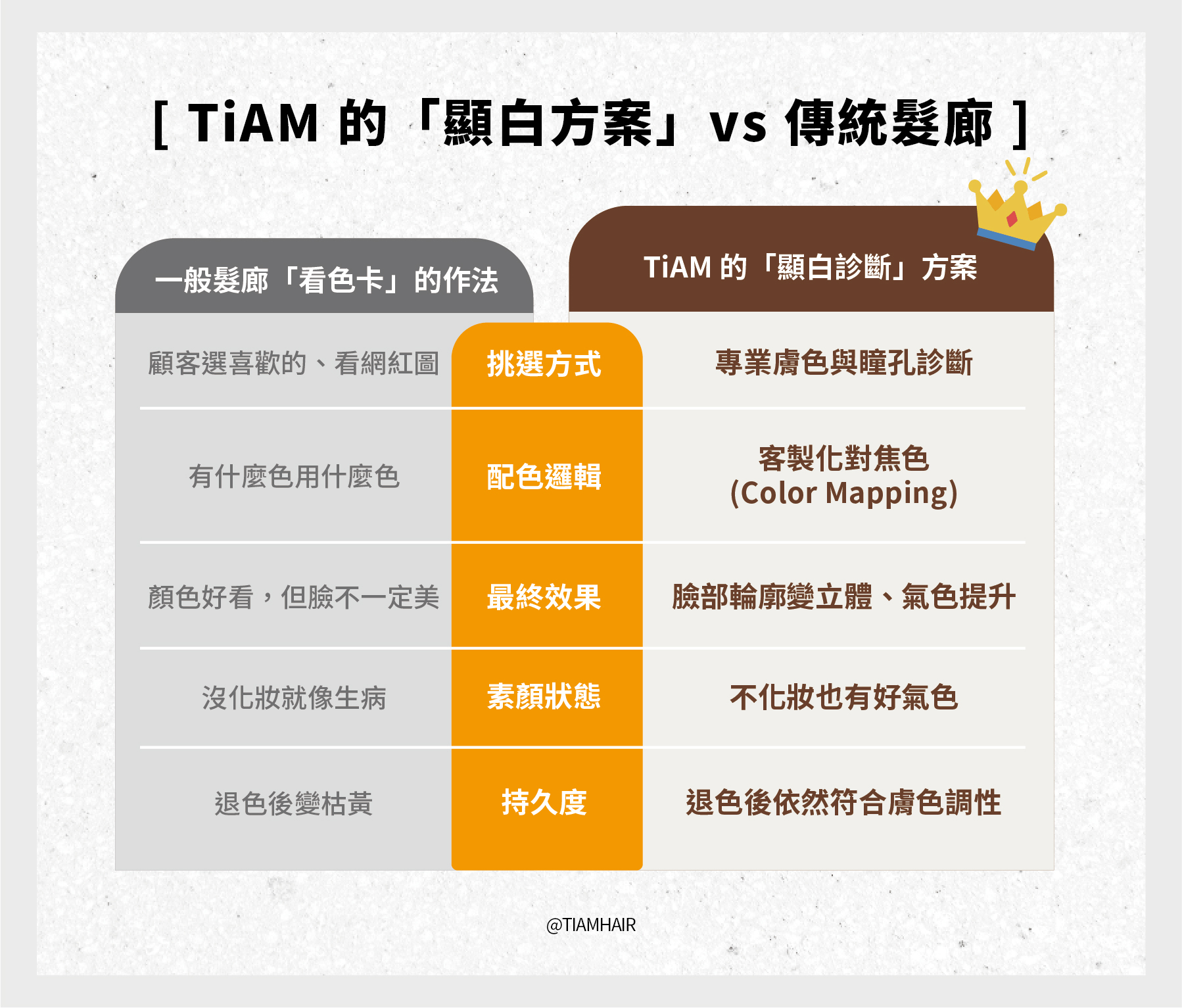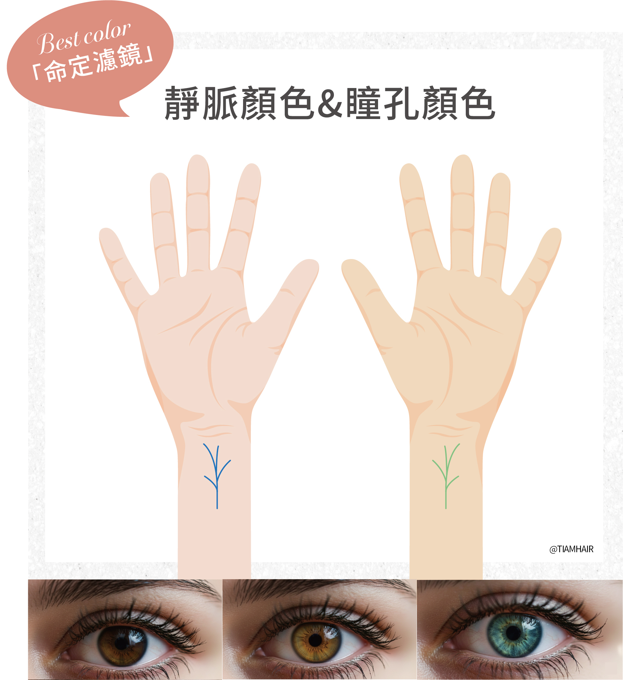 在 TiAM,我們拒絕看色卡決定顏色。我們會透過「五官色彩診斷」,判斷妳的靜脈顏色、瞳孔顏色與原生膚色,找出專屬於妳的「命定濾鏡」。