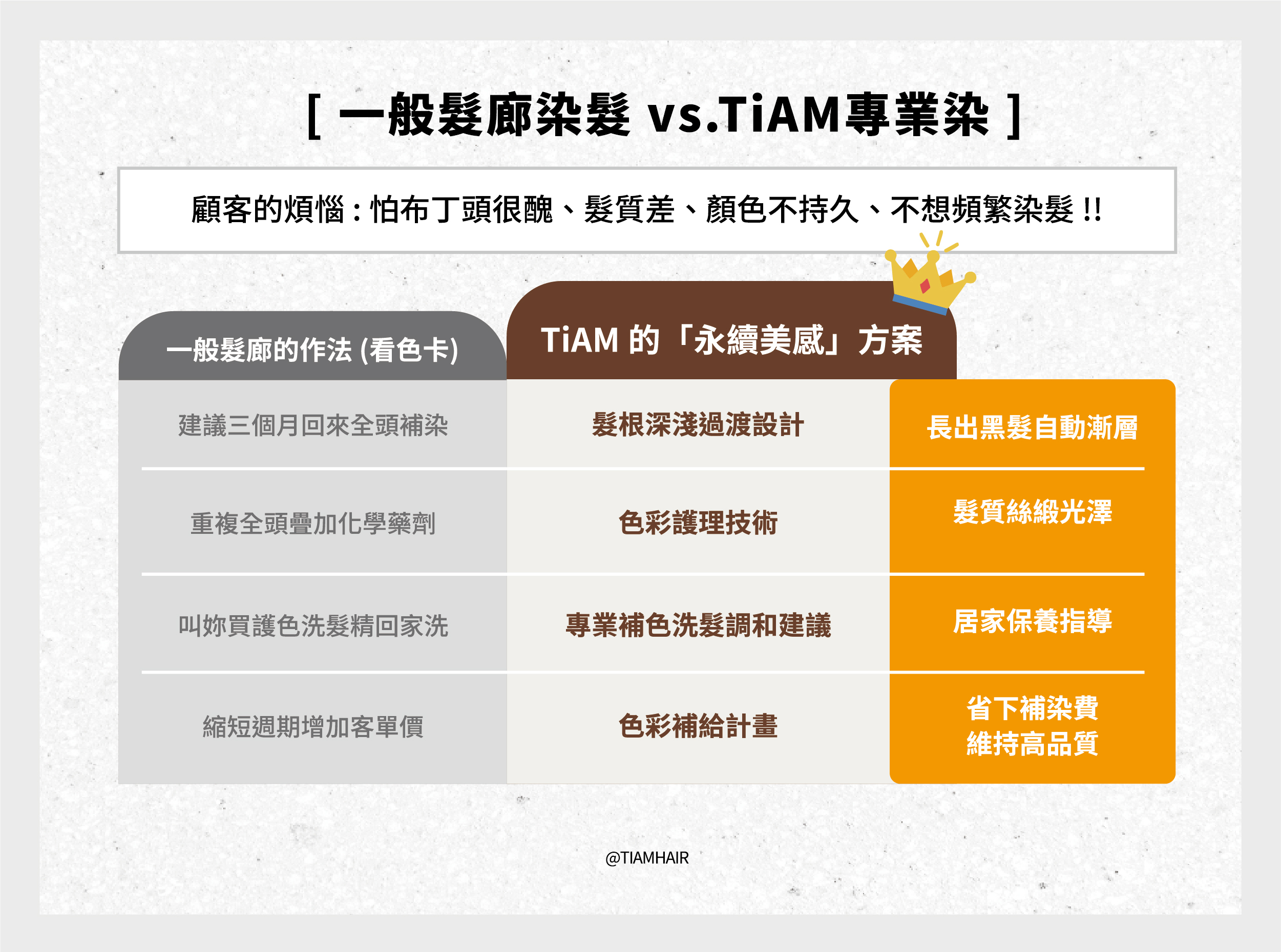 在 TiAM,我們透過技術標準,讓妳的染髮擁有超長美感保鮮期,把「變長、褪色」的過程都計算在設計內。
